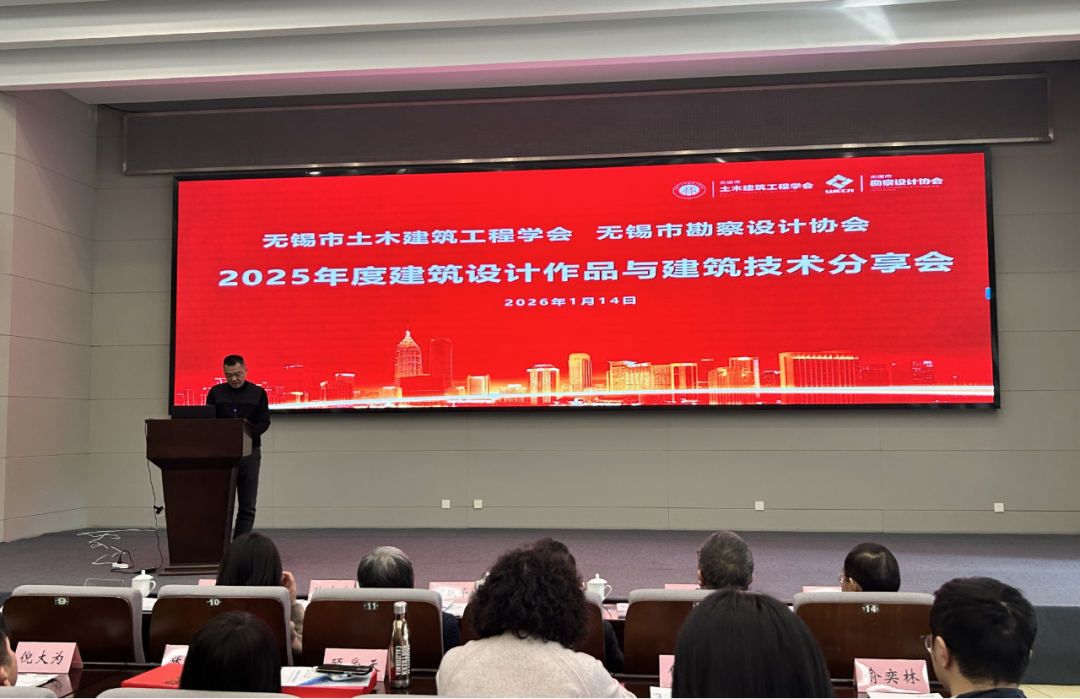 2025年度建筑设计作品与建筑技术分享会于2026年1月14日在无锡国家工业设计园举办。本次会议由无锡市土木建筑工程学会建筑设计专委会、无锡市勘察设计协会建筑师分会、无锡市勘察设计协会低碳分会三家专业协会联合主办,汇聚了无锡及周边地区建筑设计领域的众多专家学者、资深行业骨干以及优秀设计从业者,各方代表齐聚一堂,为推动区域建筑行业高质量、可持续发展搭建了高效、友好的交流平台,也为行业内先进经验的传播与创新思想的碰撞提供了优质载体。为进一步加强区域建筑行业间的交流协作,主动汲取行业前沿的建筑设计理念与先进技术成果,提升自身核心竞争力,我院积极参与,组织设计团队参加了此次会议。
